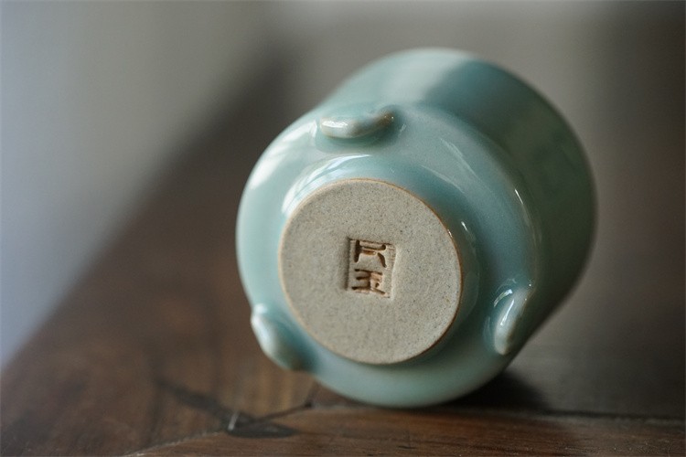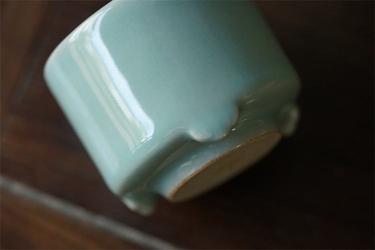 这件复刻器采用龙泉当地的朱砂泥料和天然原矿釉料,整体光素无纹,工艺精良,其灵感源自龙泉窑高级古器。