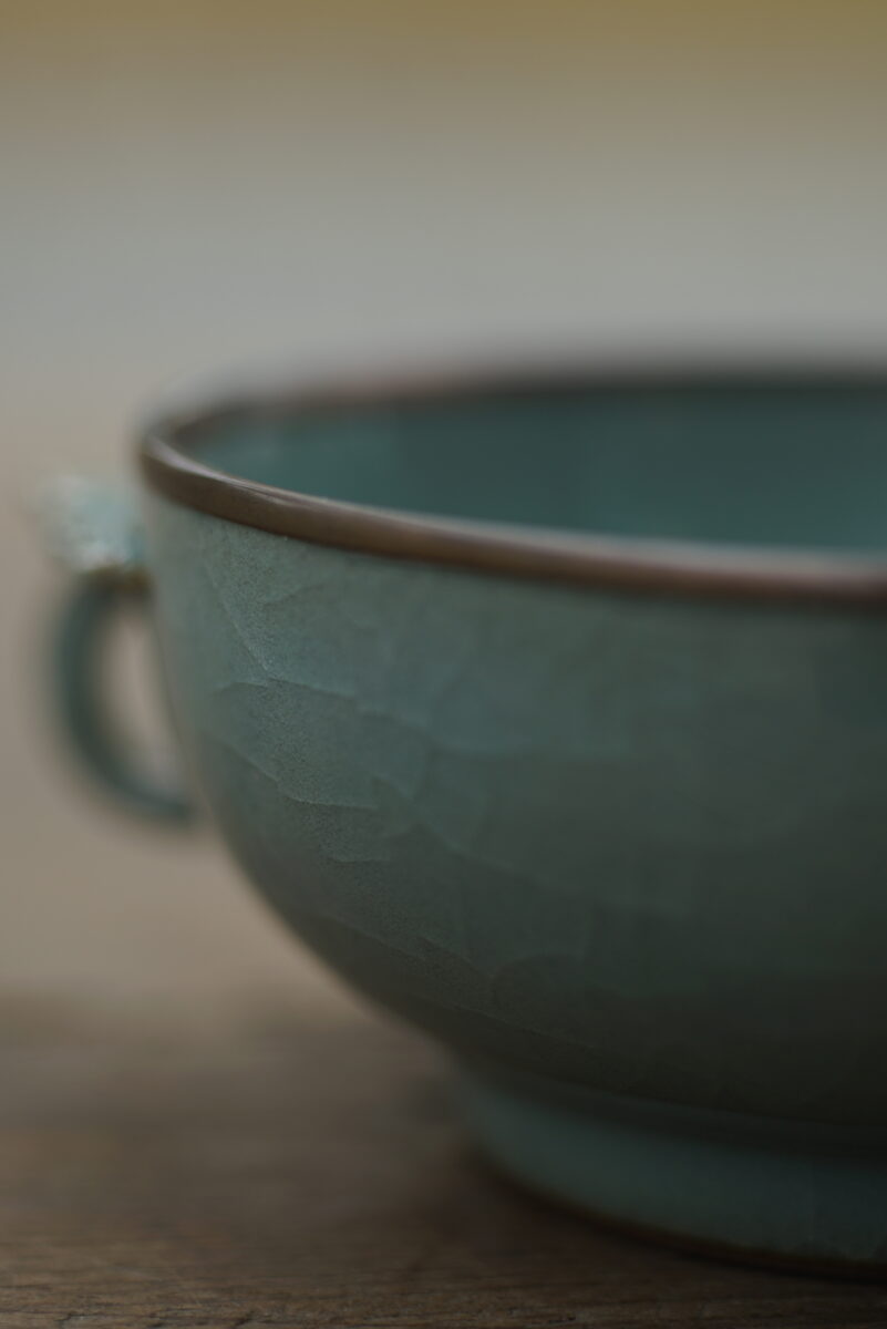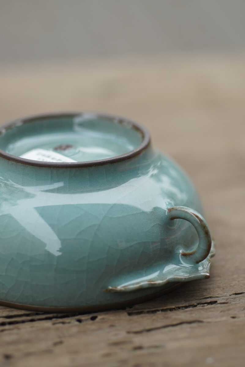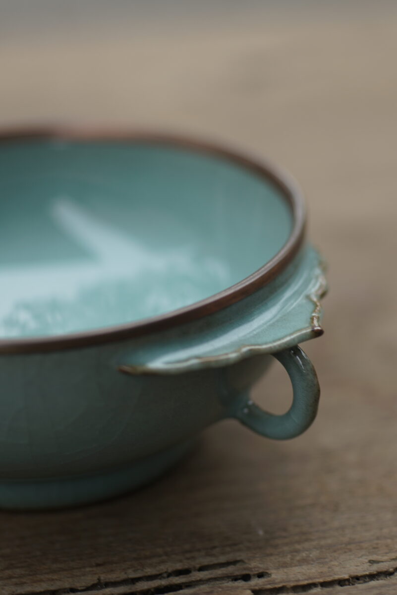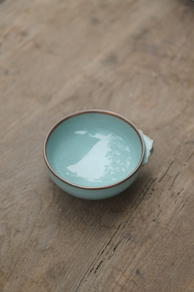采用龙泉当地优质的铁胎泥和天然原矿釉料,高温烧制而成 。口部扣铜边, 工艺精良,灵感来源于南宋时期龙泉窑高级古器