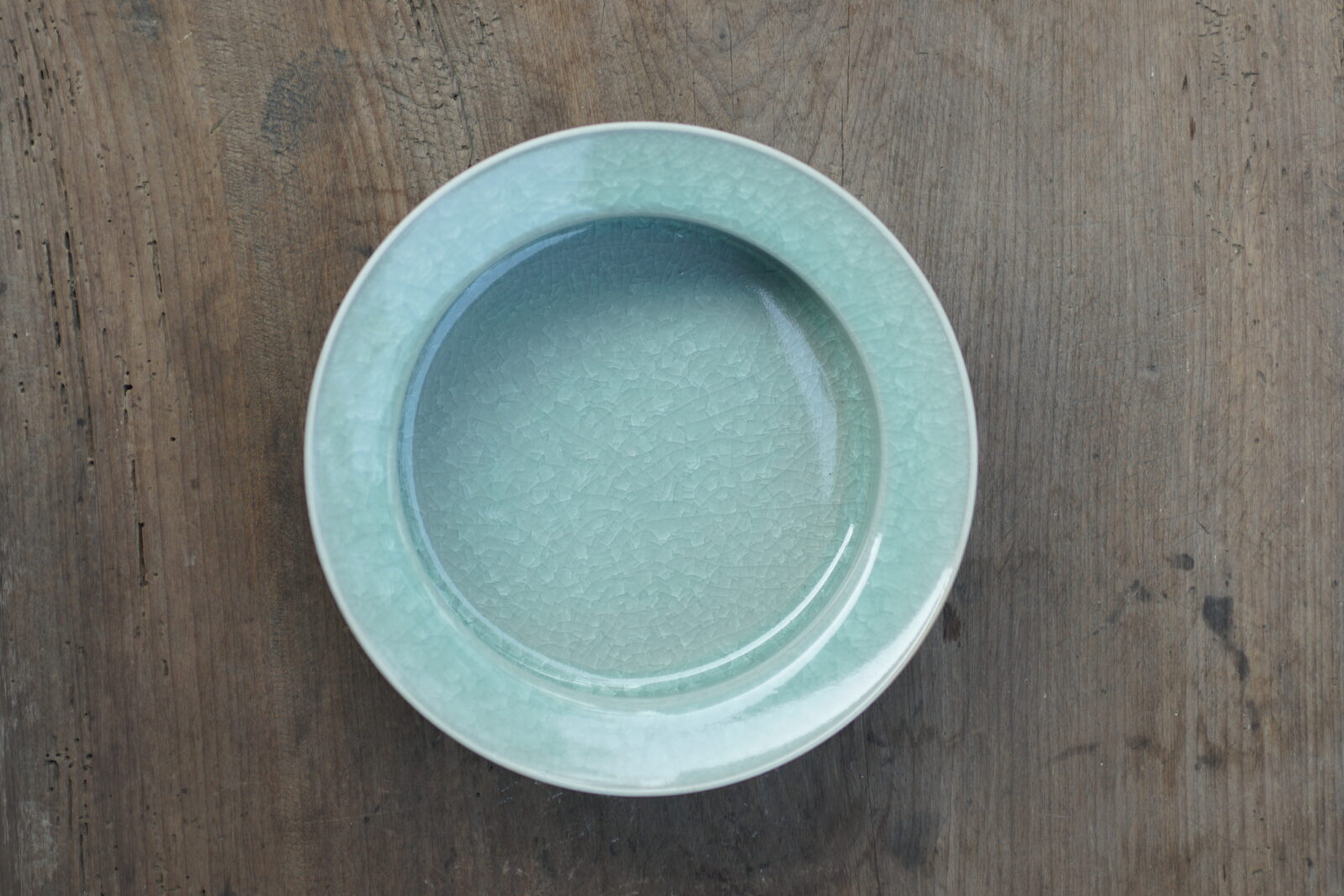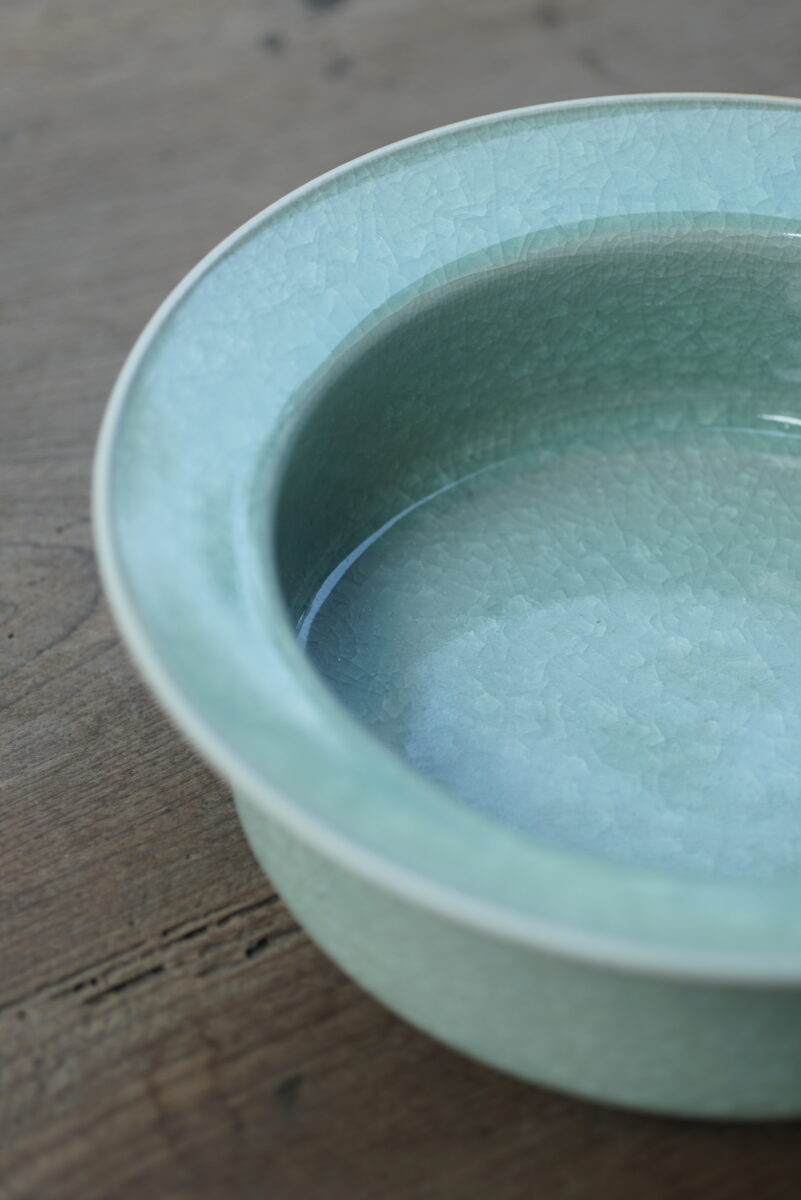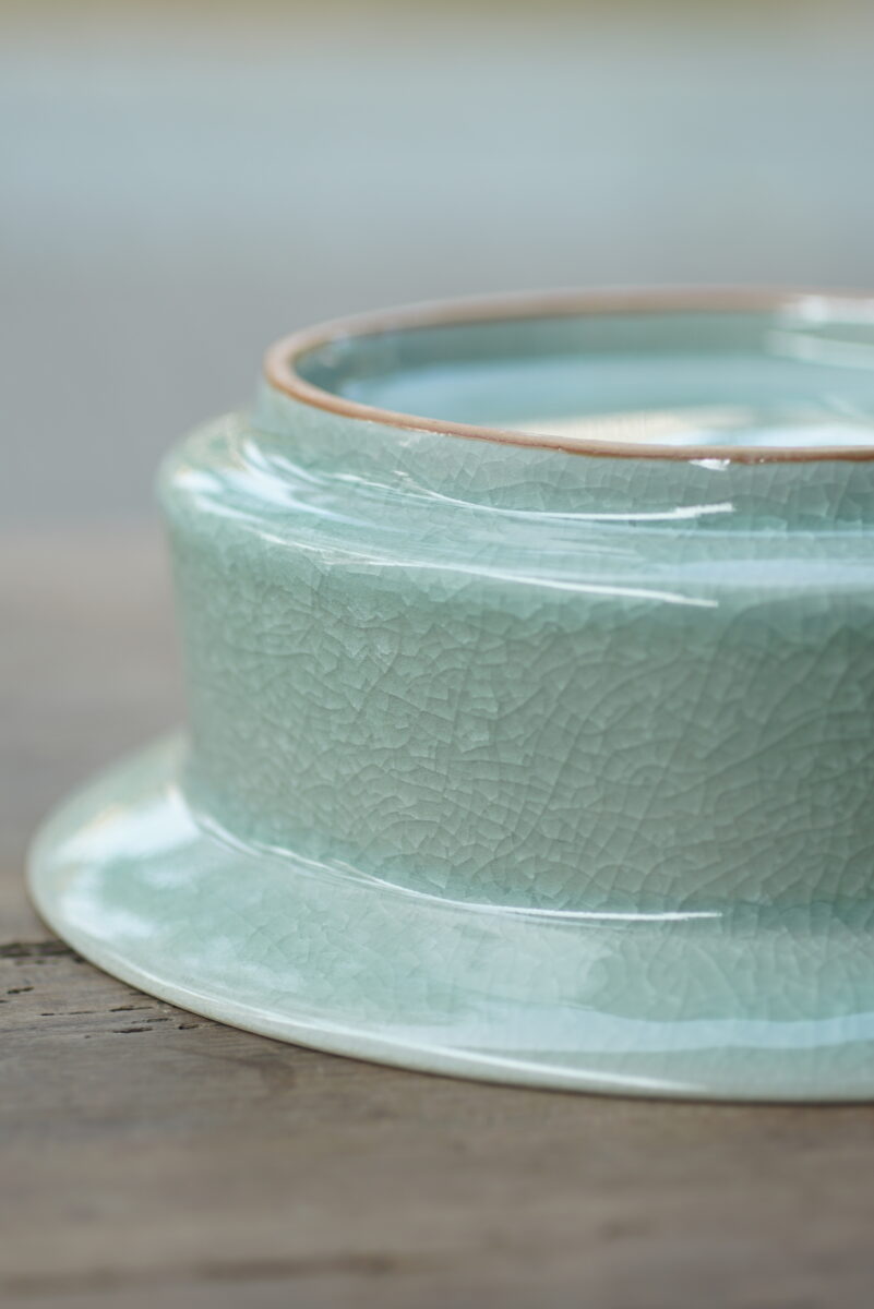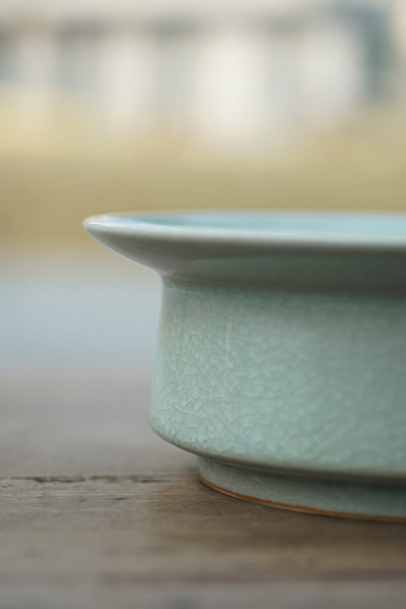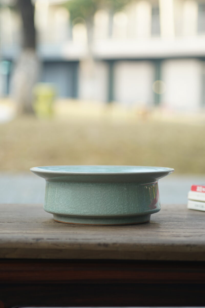 采用龙泉当地优质的朱砂泥和天然原矿釉料,高温烧制而成。纯手工制作,宽圈足,工艺精良。器型来源于南宋龙泉窑官用器皿。