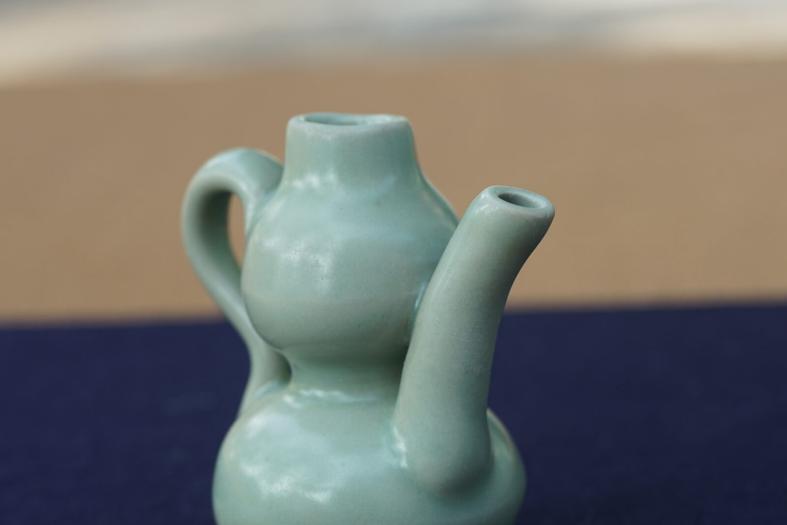 器做葫芦形,对称装流和把,光素极简。呈粉青釉色,釉面温润。器型古朴精致,制作工兿精良,应为经典文房用器。