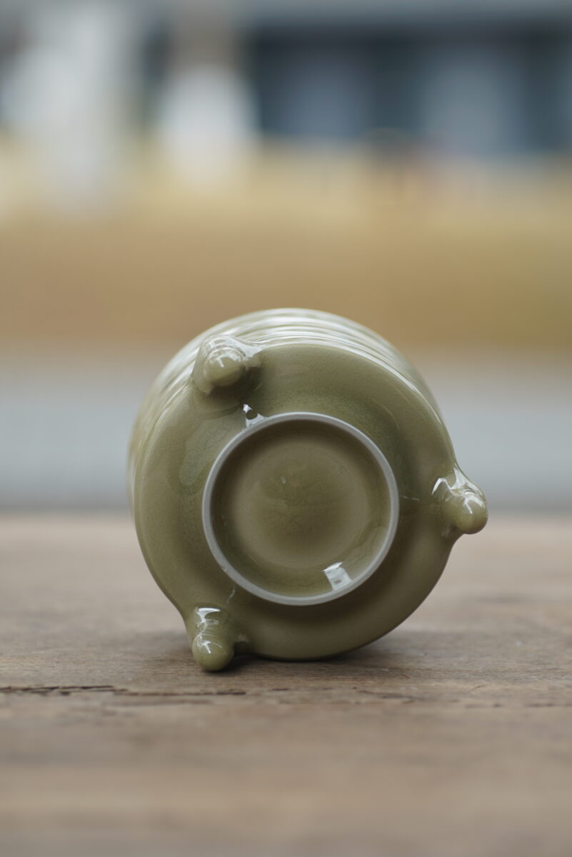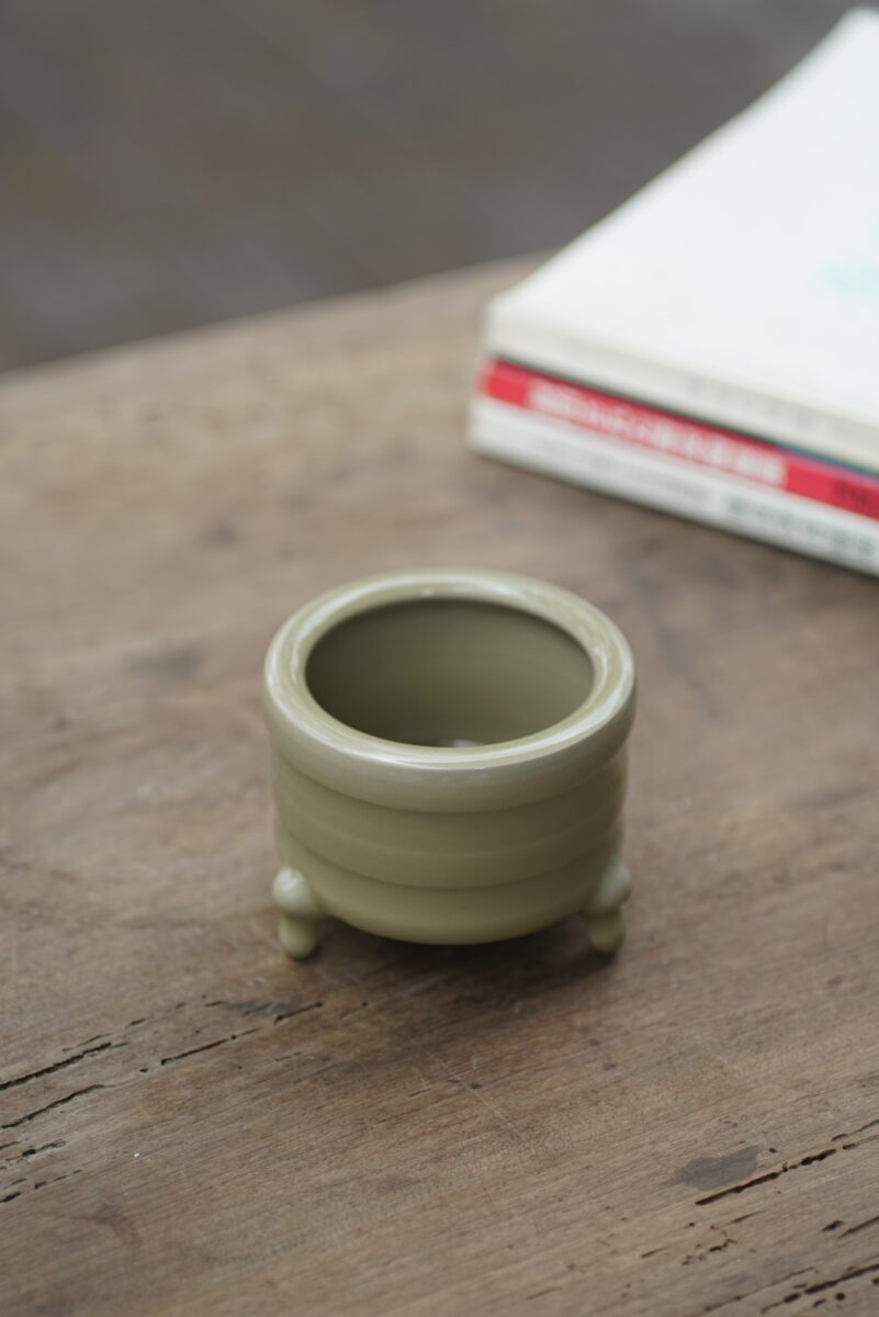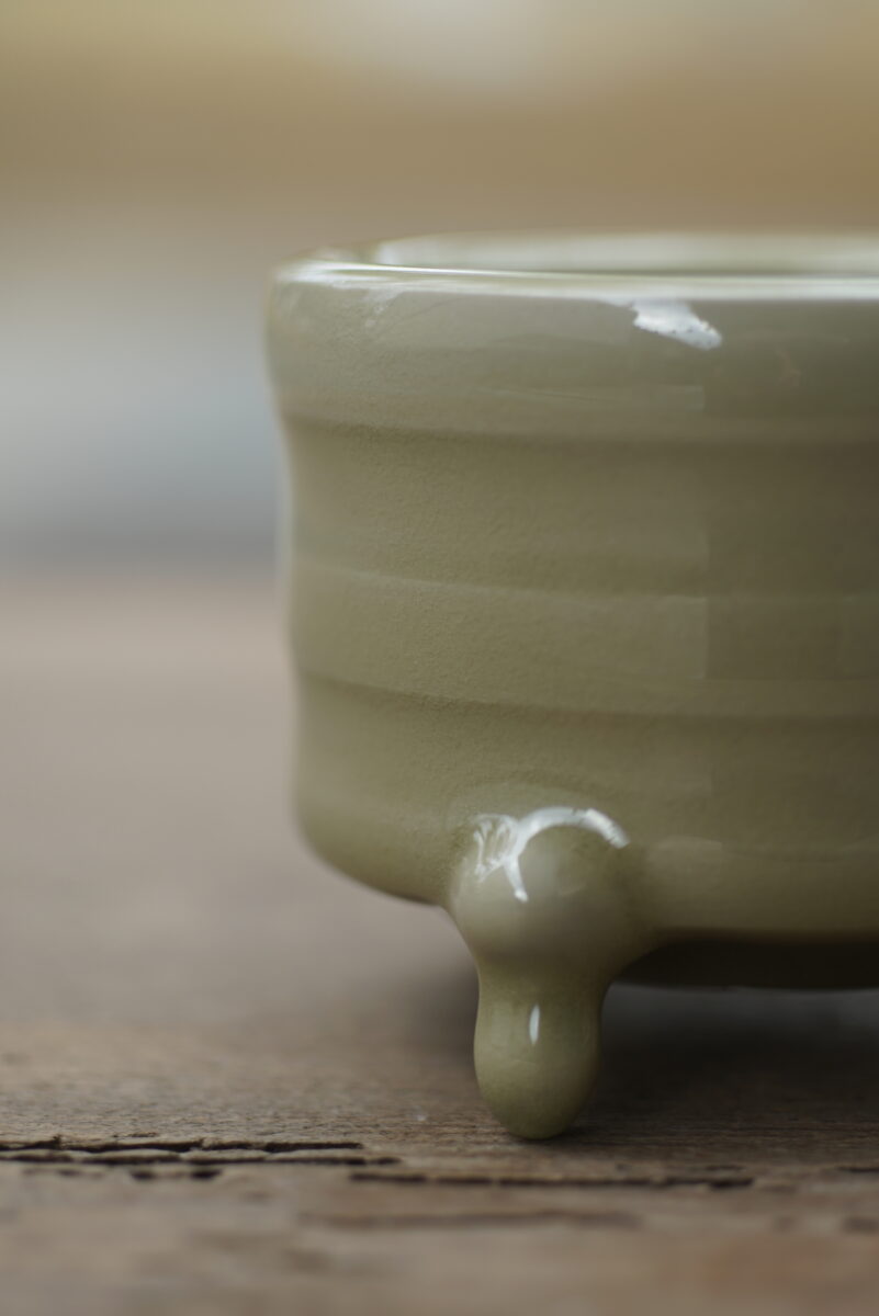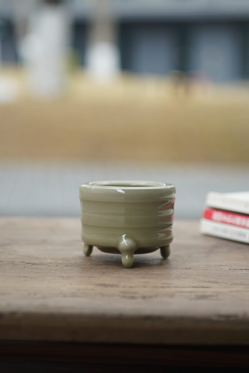 采用龙泉当地优质的朱砂泥和原矿釉料。纯手工制作,工艺精良。器型灵感来源于青铜器造型南宋龙泉窑奁式炉,古朴自然,经典香道用具。