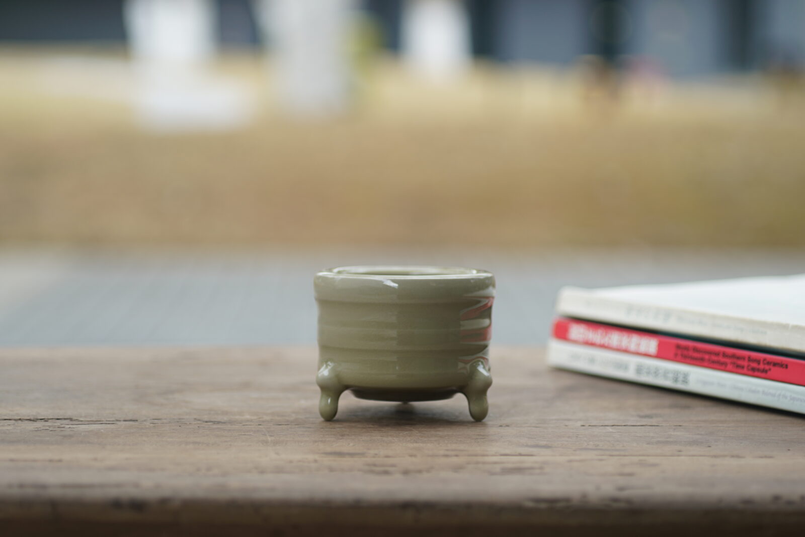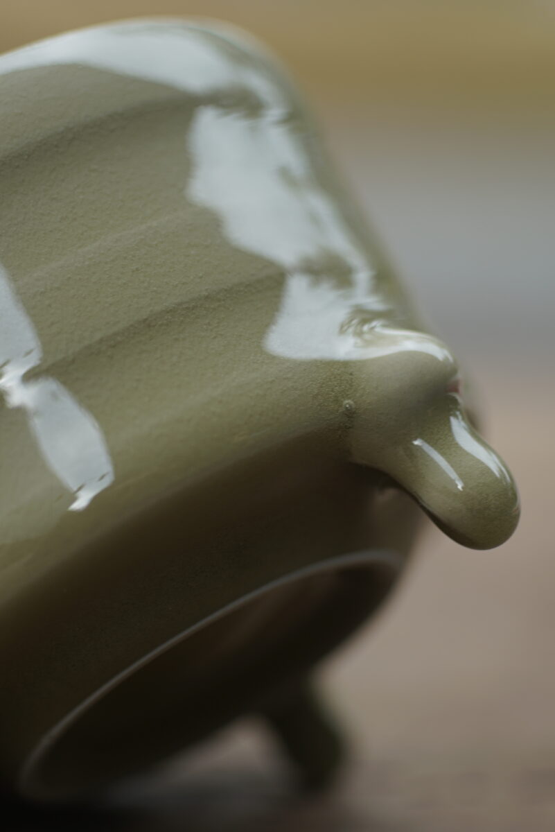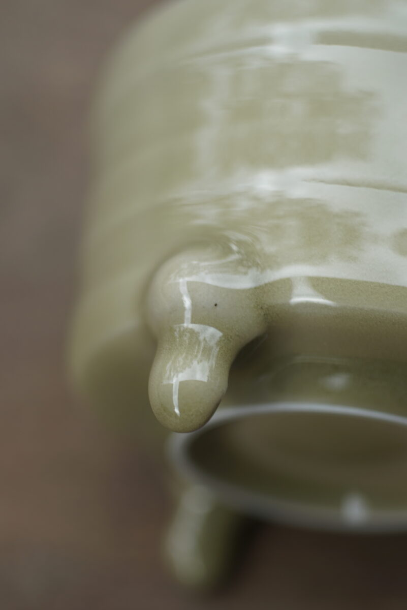 采用龙泉当地优质的朱砂泥和原矿釉料。纯手工制作,工艺精良。器型灵感来源于青铜器造型南宋龙泉窑奁式炉,古朴自然,经典香道用具。
