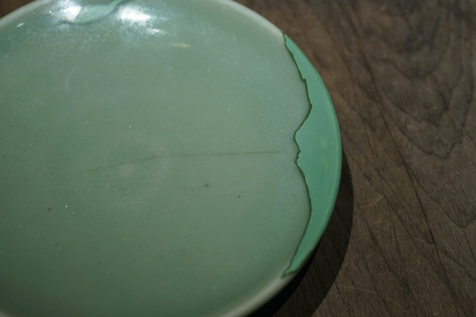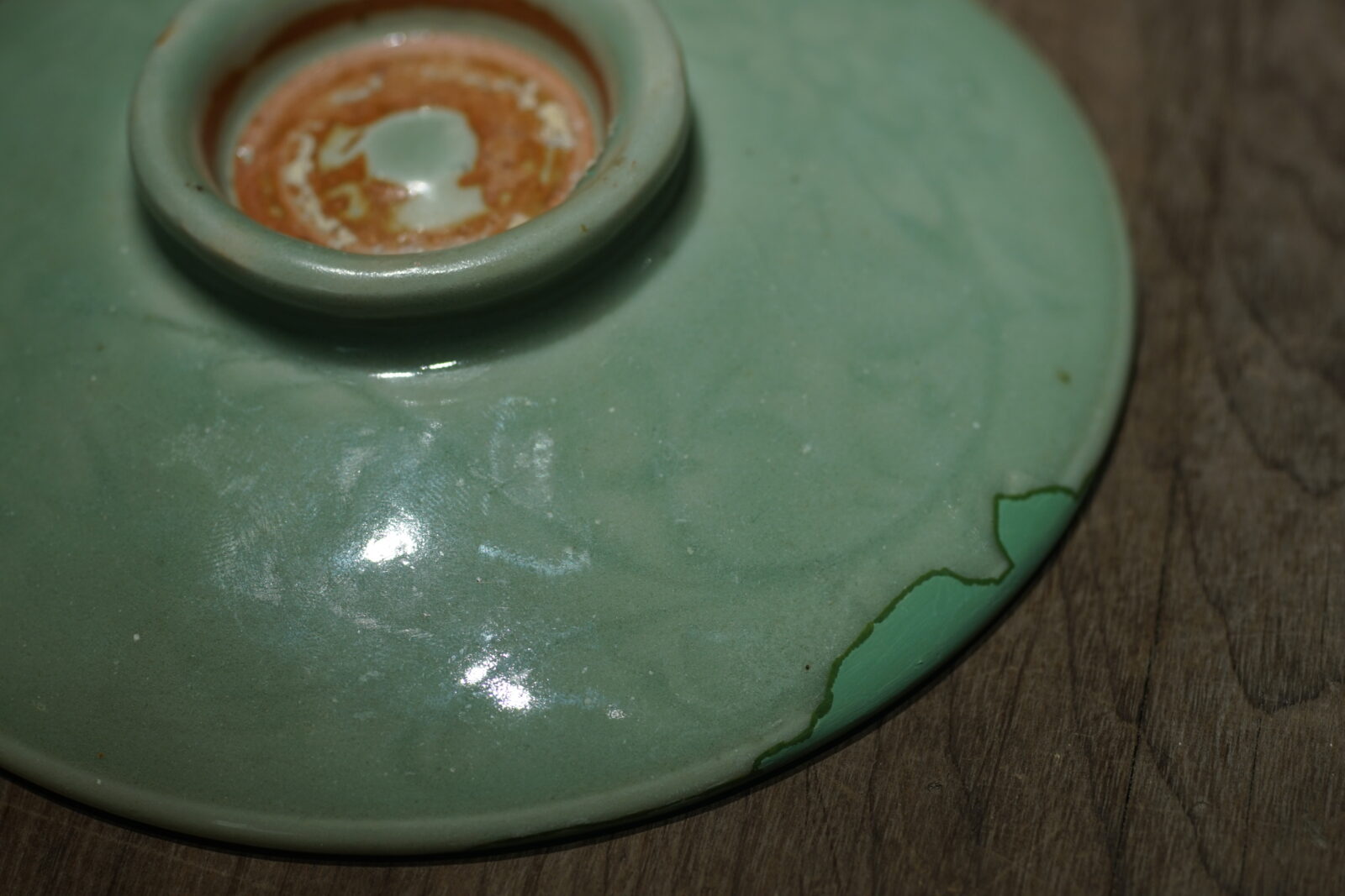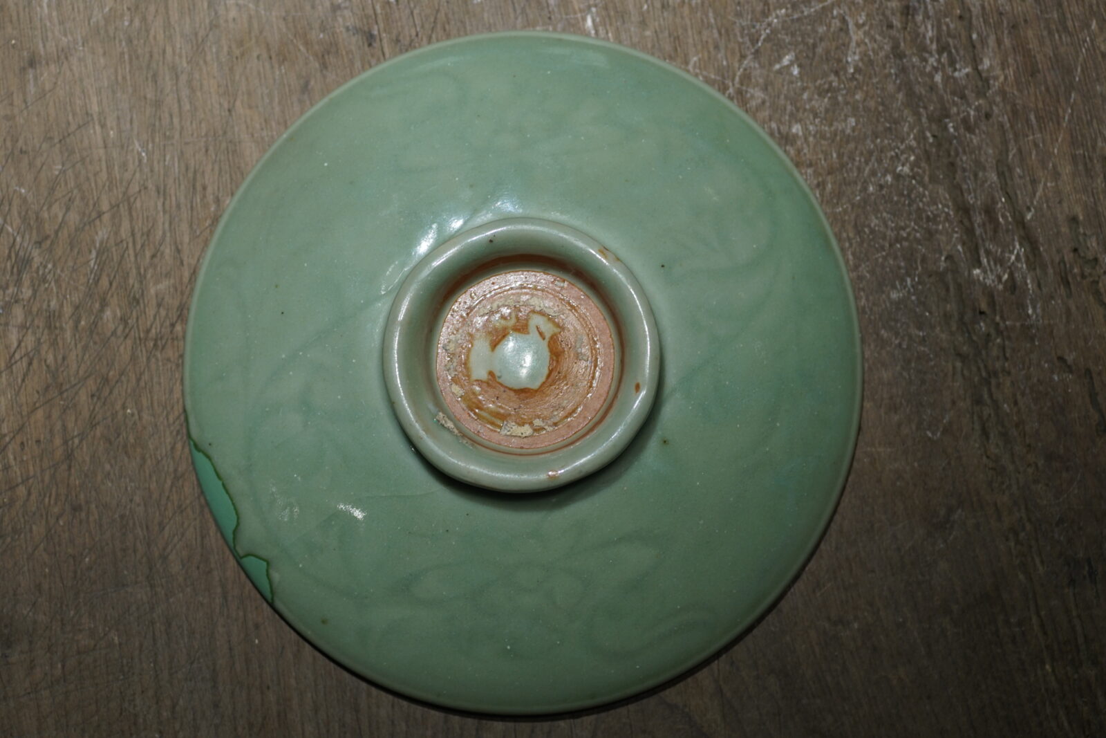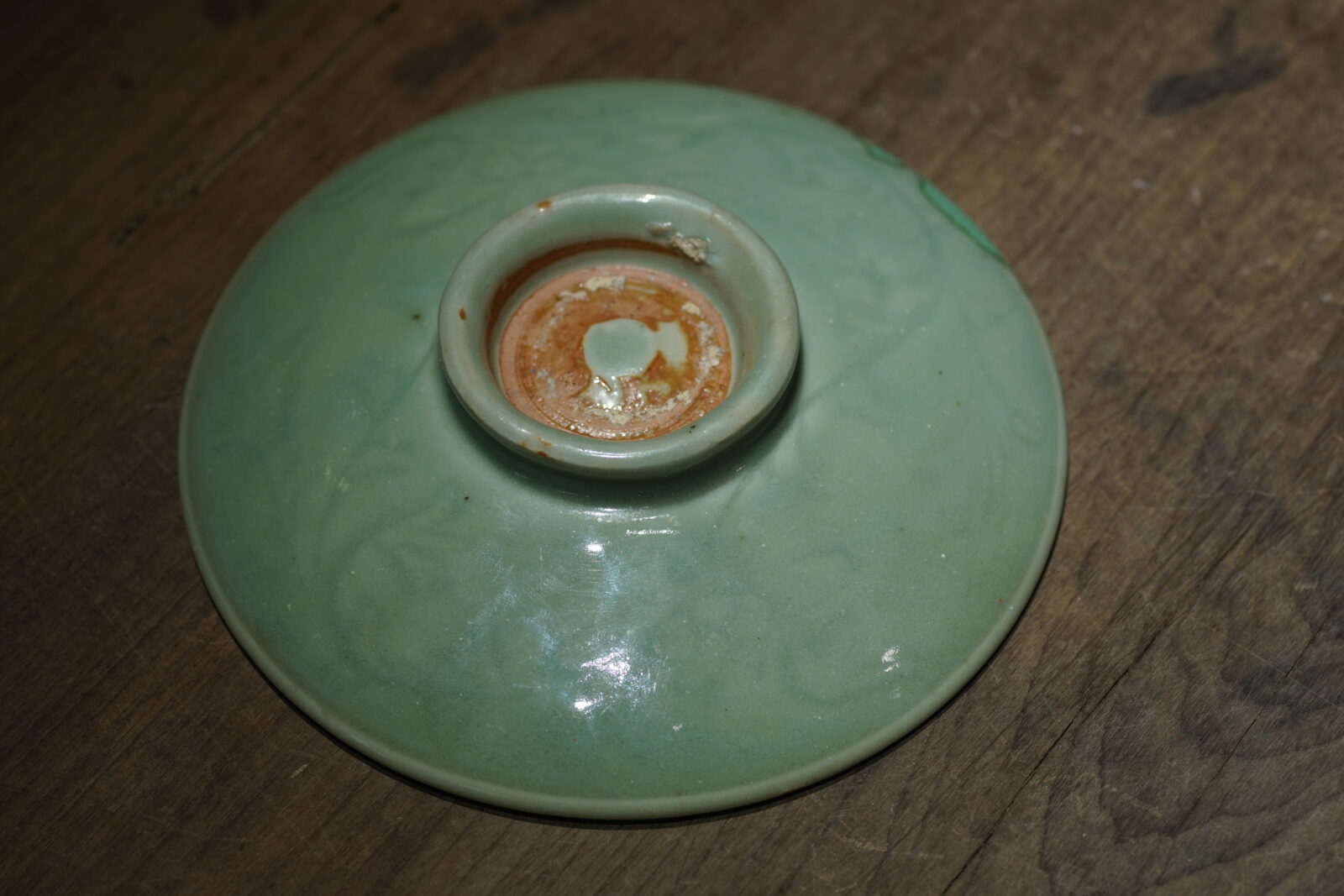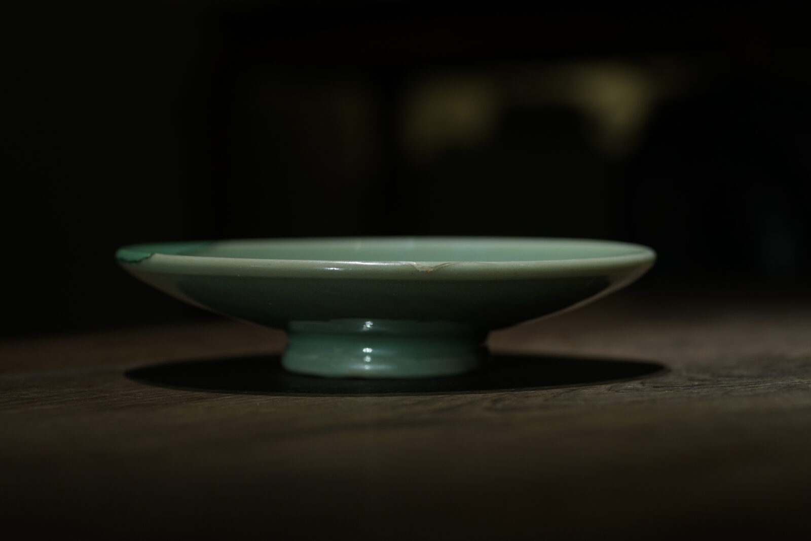 盘面光素,后壁刻缠枝花卉,高圈足。纯正梅子青釉色,釉面厚润光泽。器型古朴,有洪武永乐处州官窑风格。口沿有磕已修补.