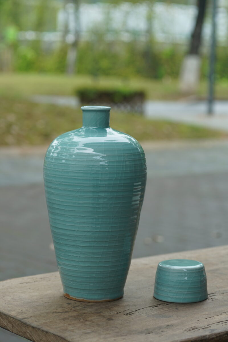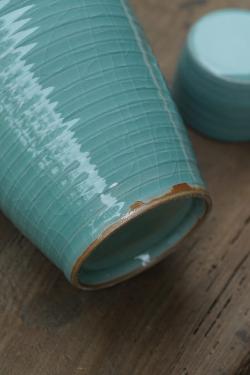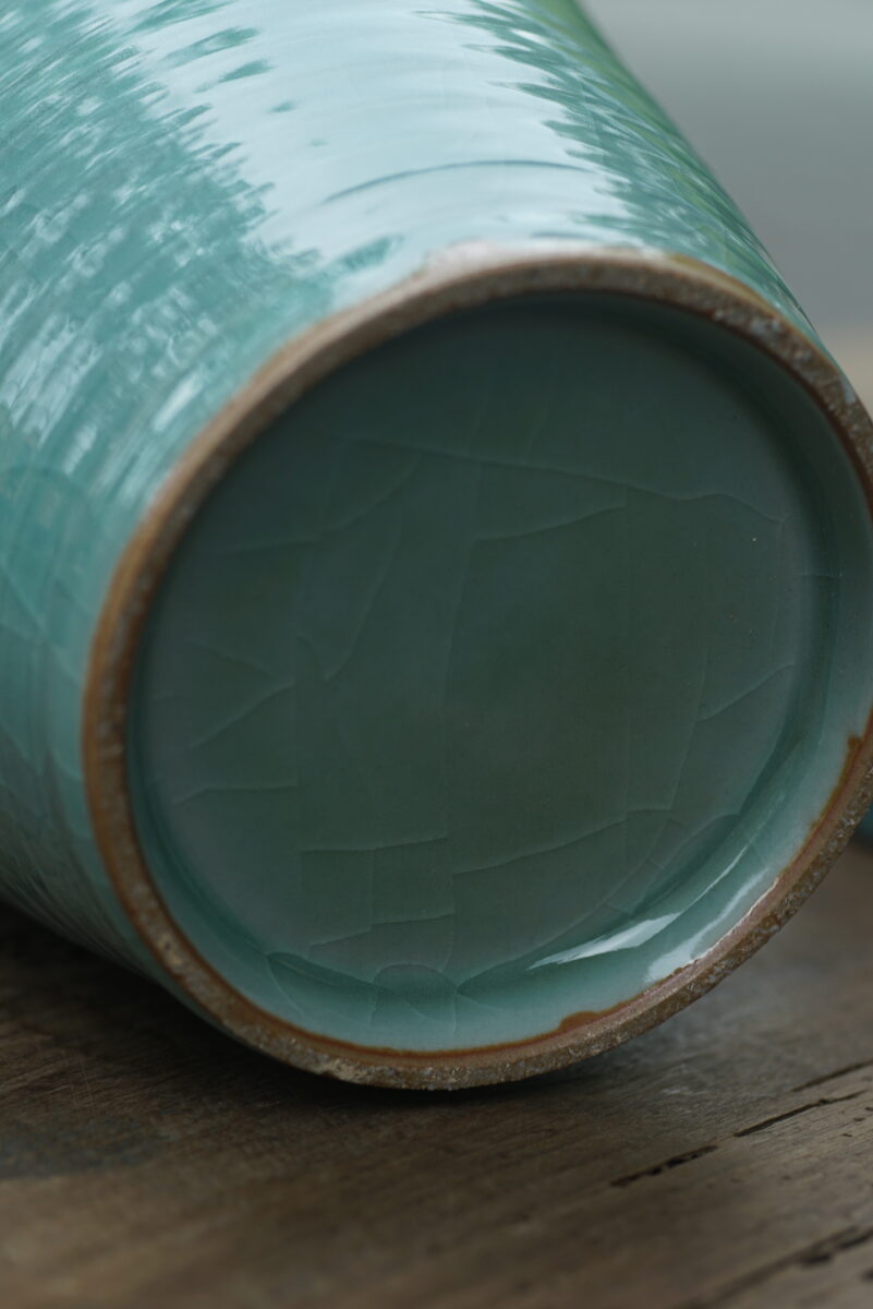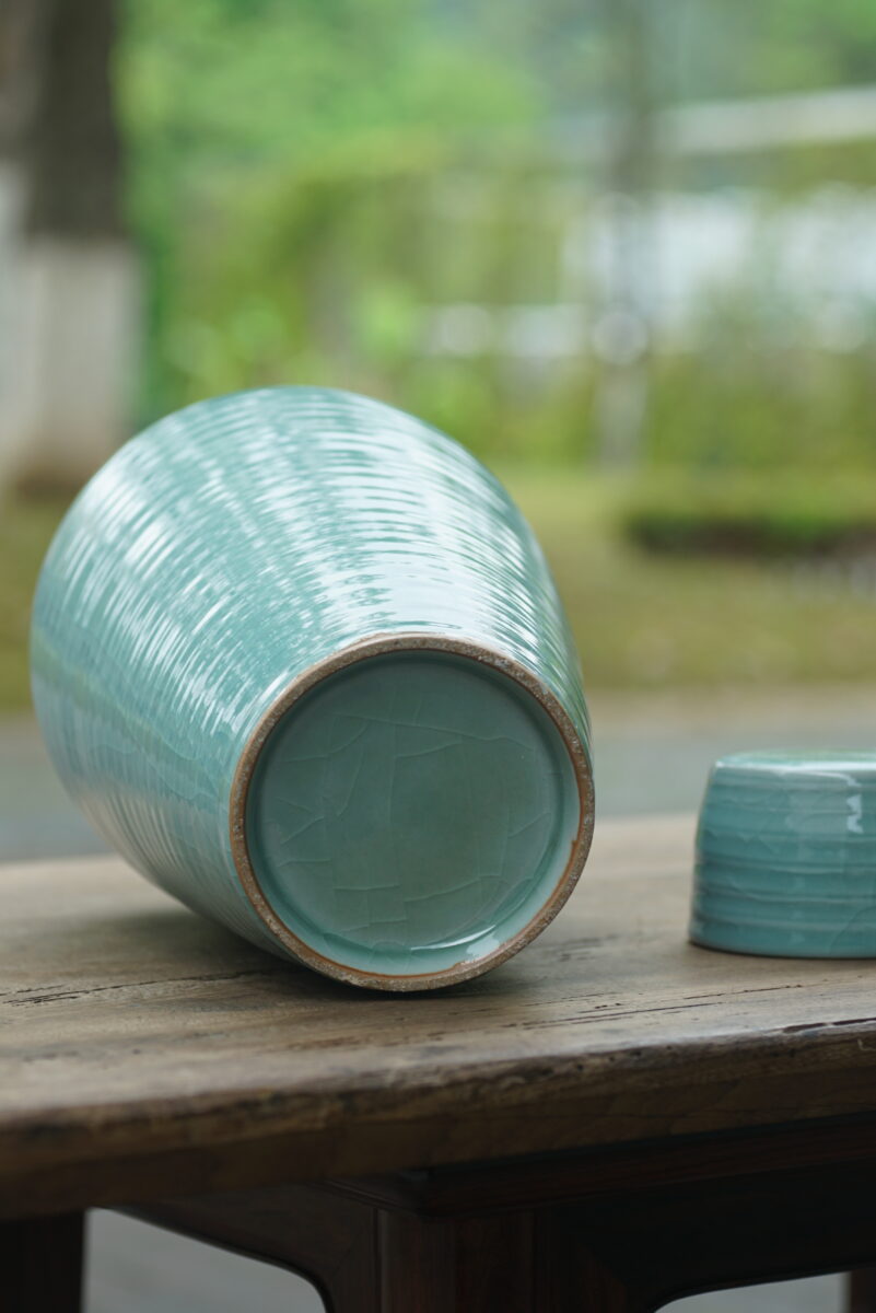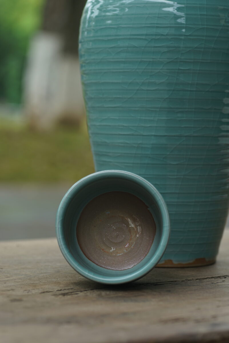 采用龙泉当地优质的朱砂泥和天然原矿釉料,龙窑柴烧。纯手工制作, 工艺精良。其灵感来源于南宋龙泉窑高级立件。