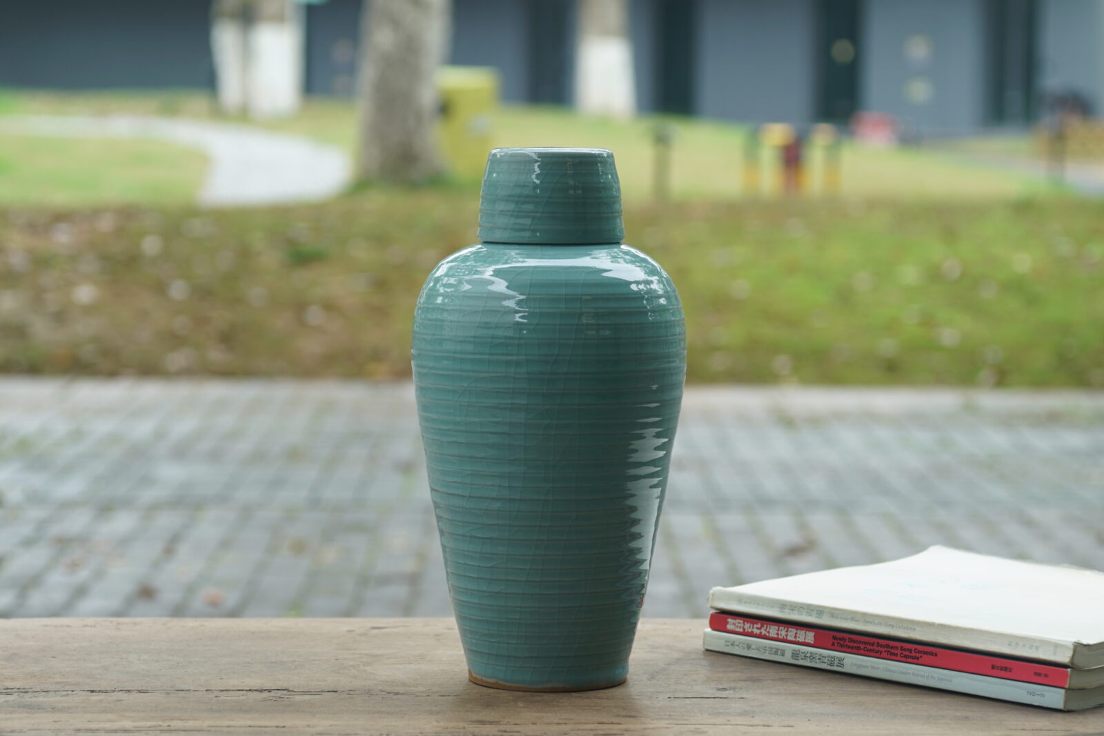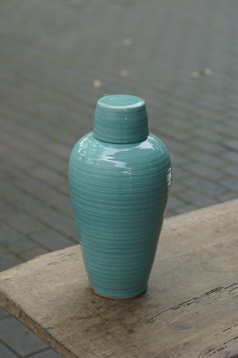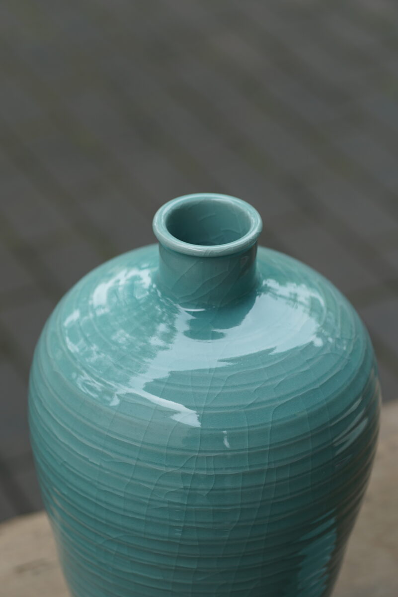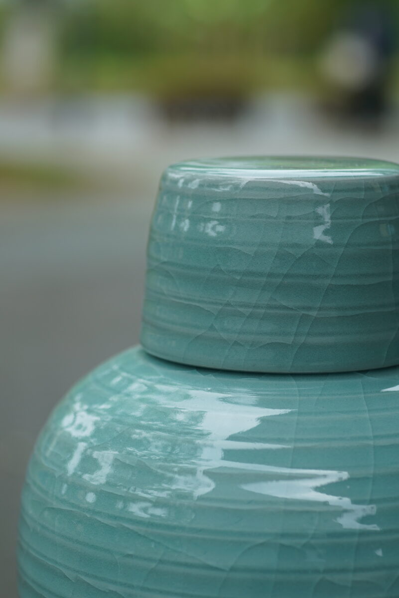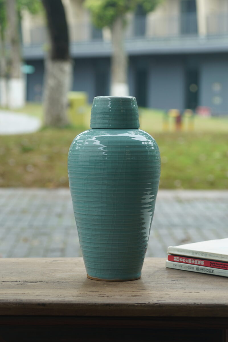 采用龙泉当地优质的朱砂泥和天然原矿釉料,龙窑柴烧。纯手工制作, 工艺精良。其灵感来源于南宋龙泉窑高级立件。