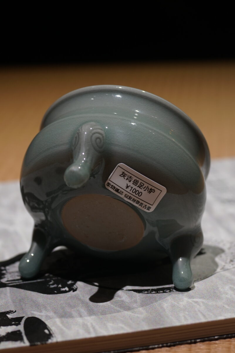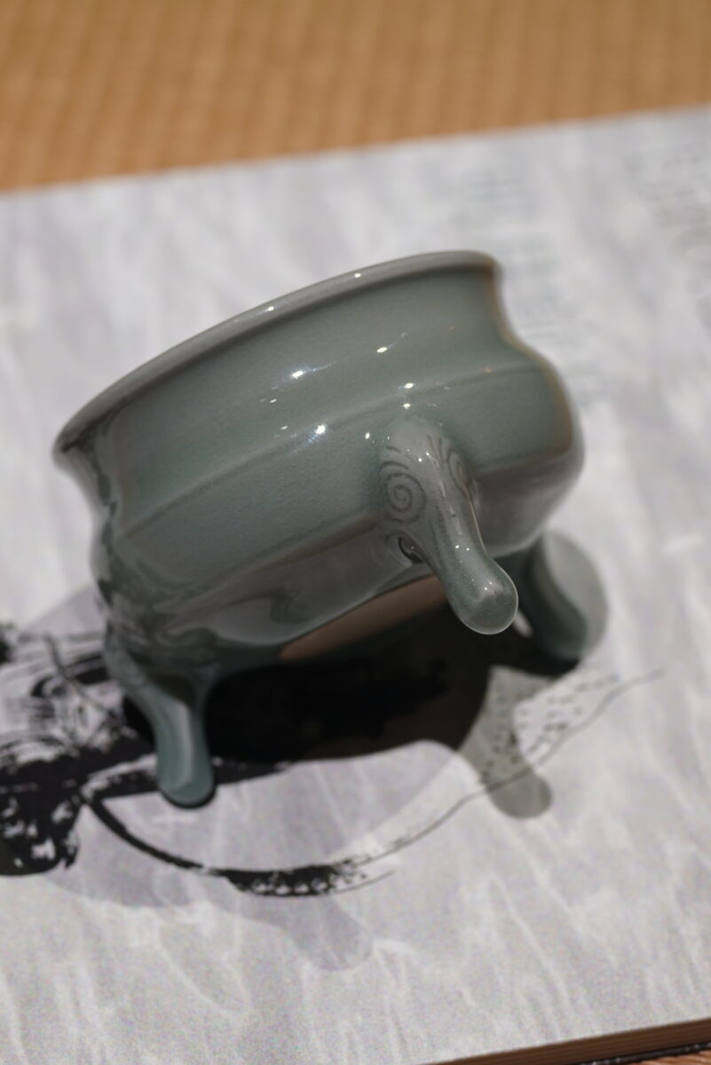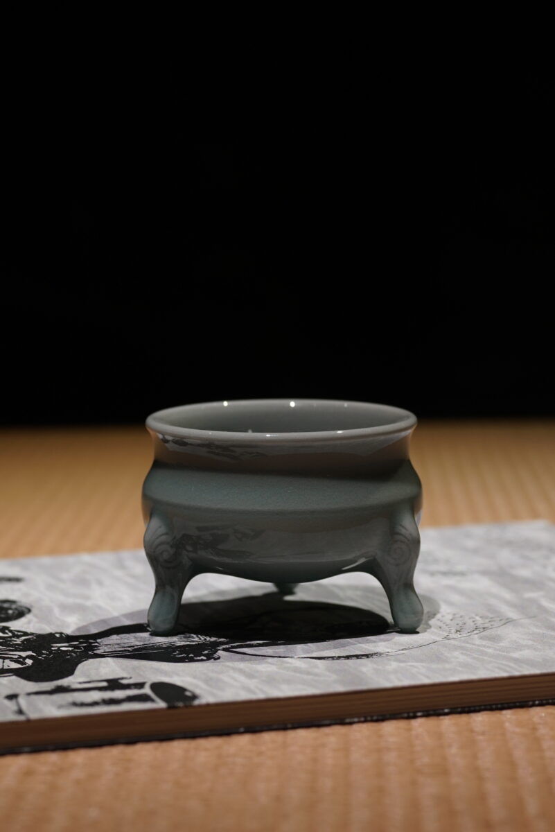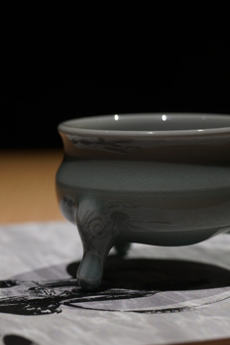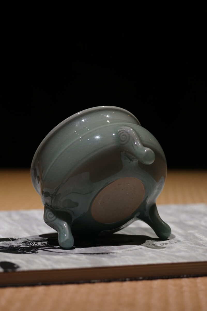 采用龙泉当地优质的朱砂泥和原矿釉料。纯手工制作,工艺精良。器型灵感来源于青铜器和南宋龙泉窑兽足炉,古朴自然,经典香道用具。