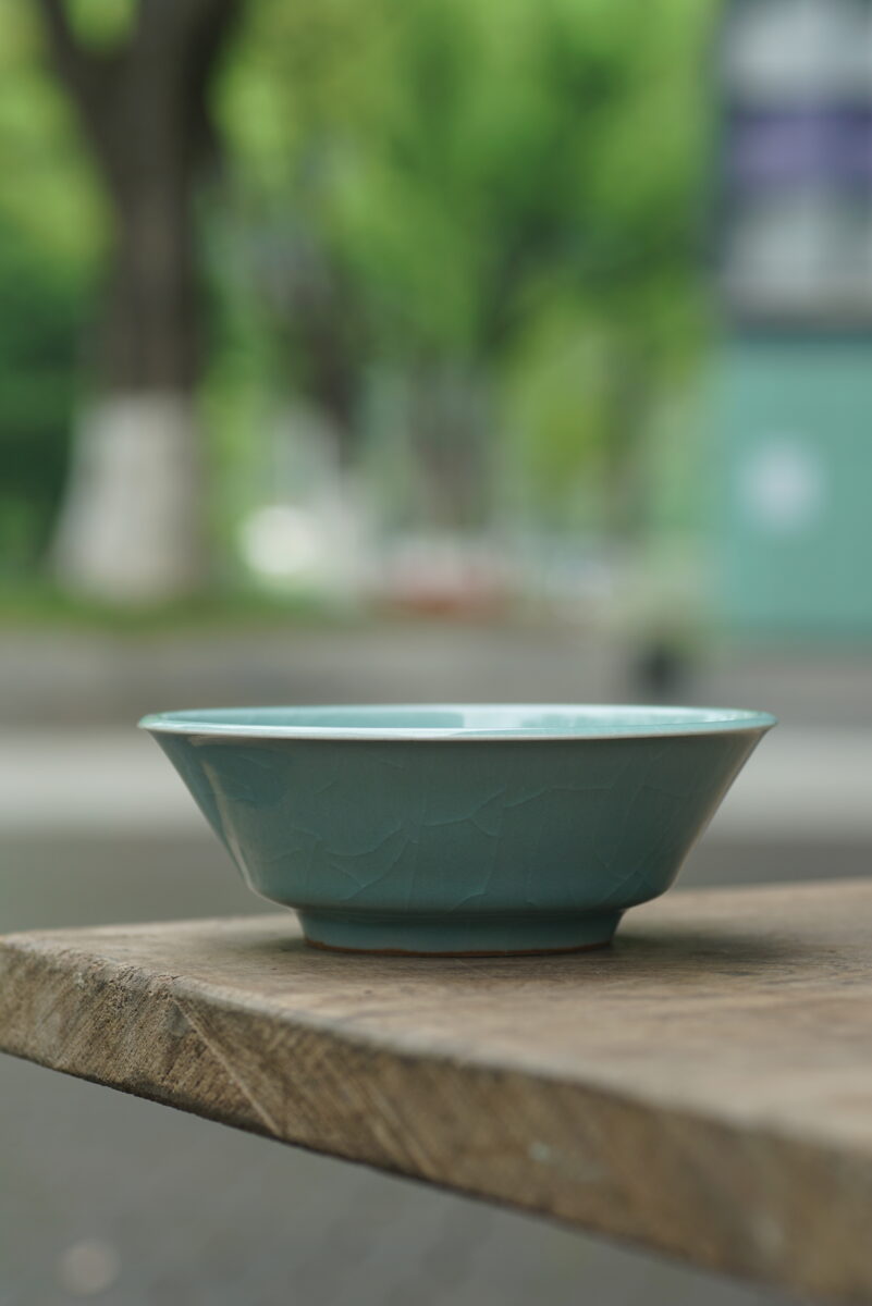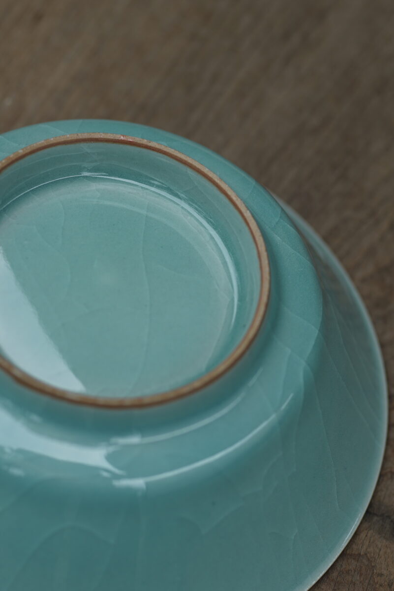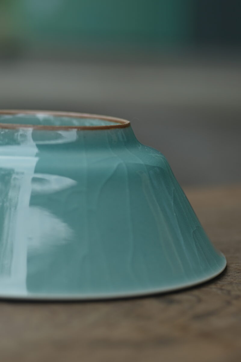 这件复刻器采用龙泉当地的朱砂泥料和天然原矿釉料,纯手工制作,龙窑柴烧,工艺精良,其灵感源自南宋龙泉窑高级实用器。