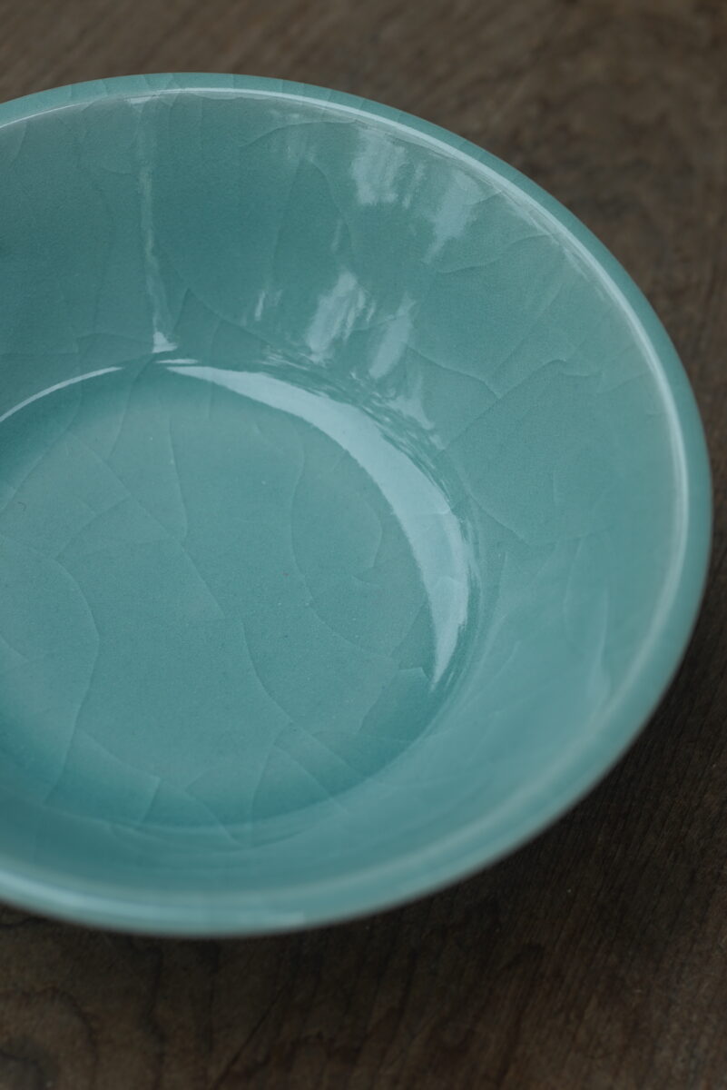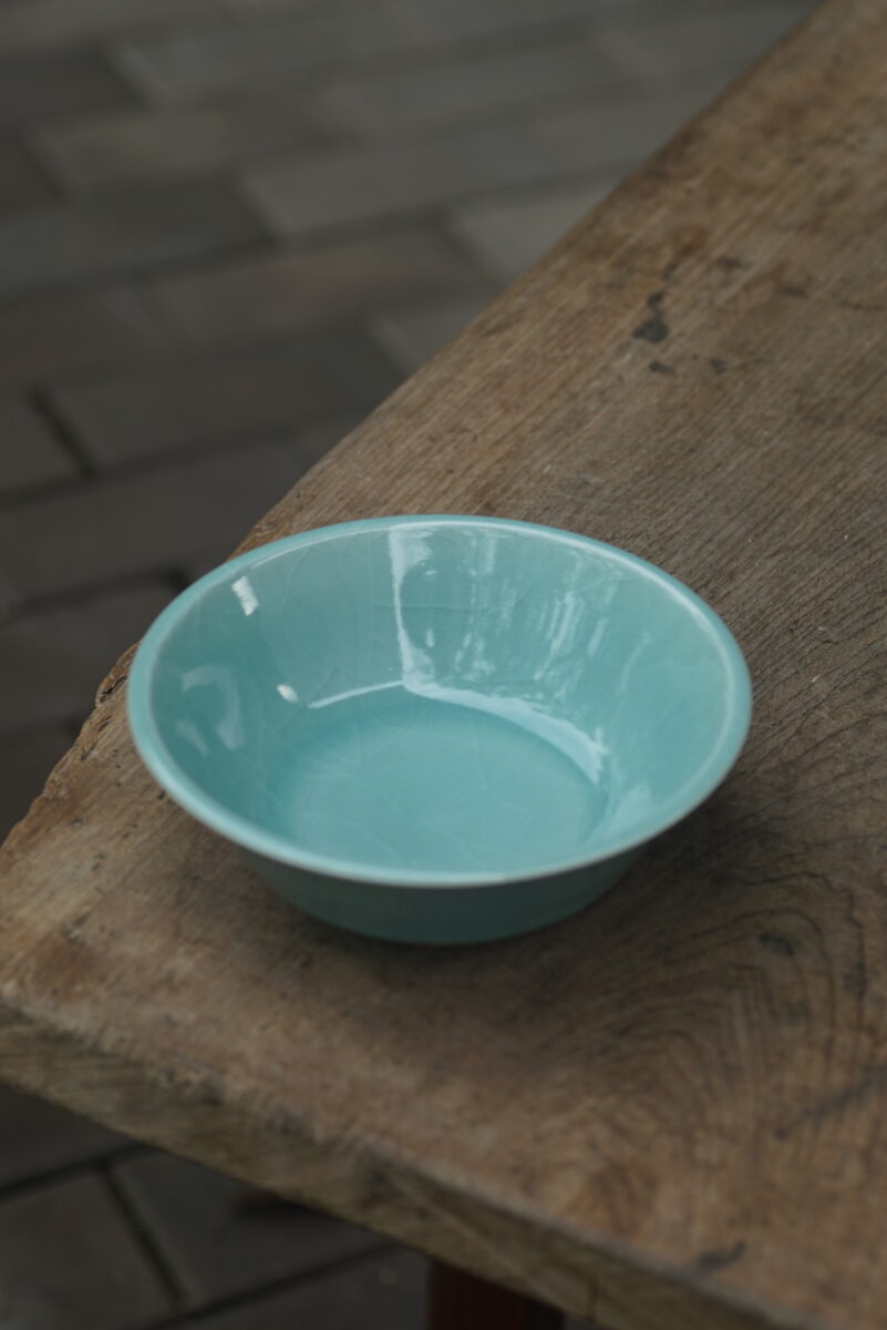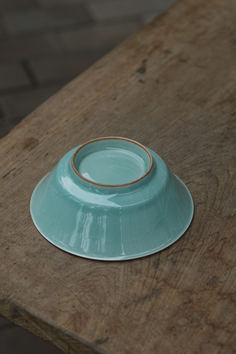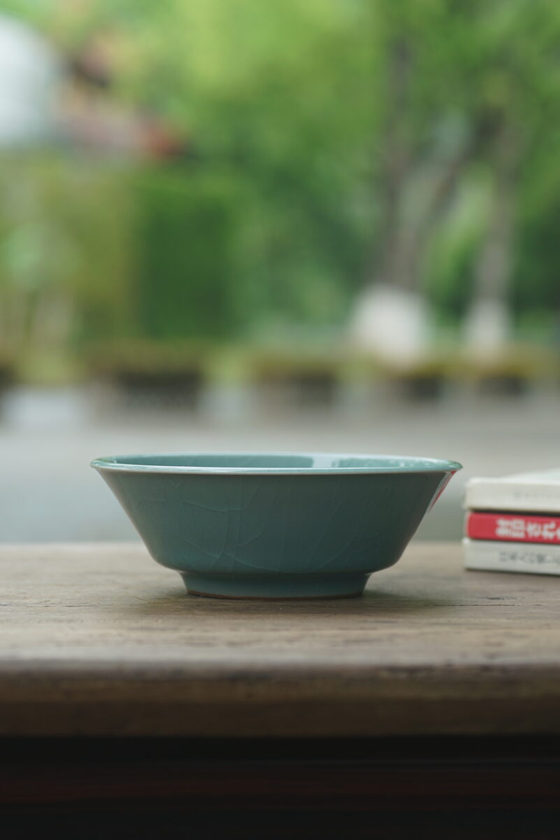 这件复刻器采用龙泉当地的朱砂泥料和天然原矿釉料,纯手工制作,龙窑柴烧,工艺精良,其灵感源自南宋龙泉窑高级实用器。