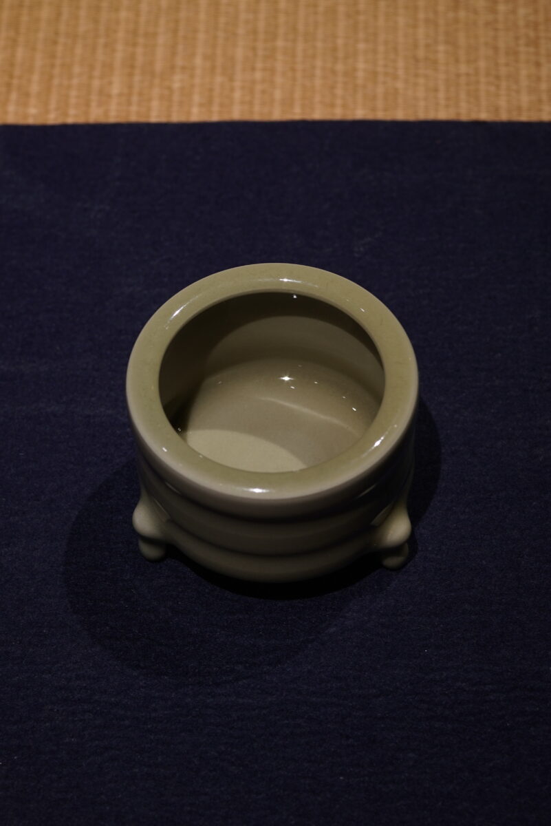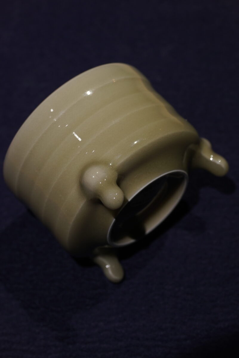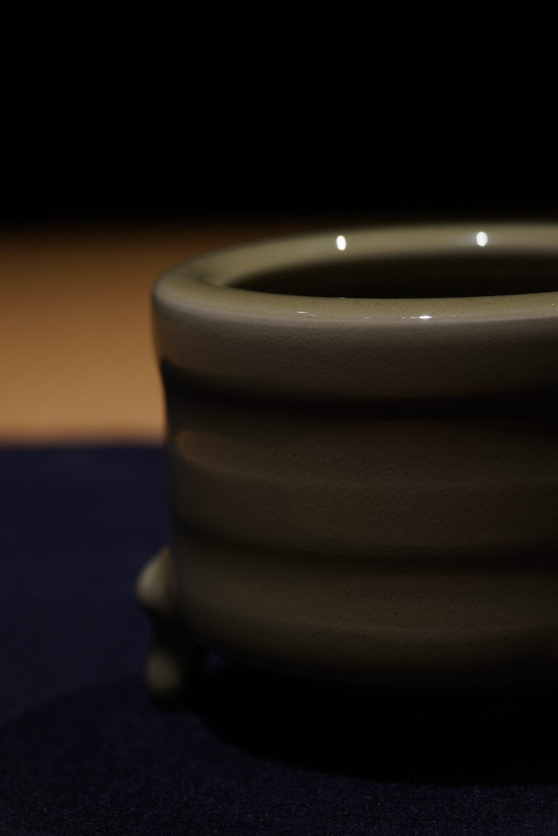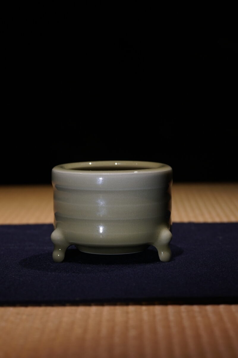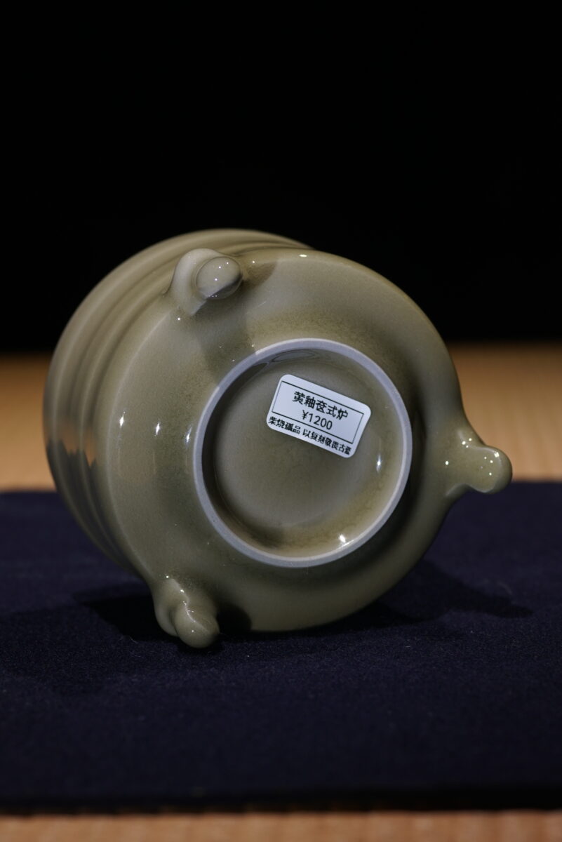 高6.5cm 外口径8.5cm 内口径6.5cm采用龙泉当地优质的朱砂泥和原矿釉料。纯手工制作,工艺精良。器型灵感来源于青铜器造型南宋龙泉窑奁式炉,古朴自然,经典香道用具。