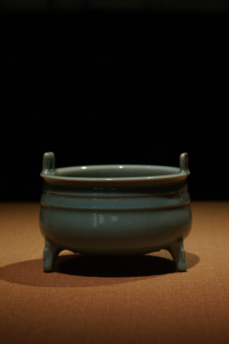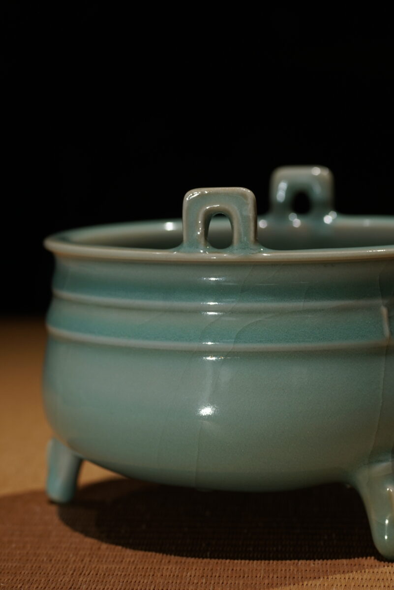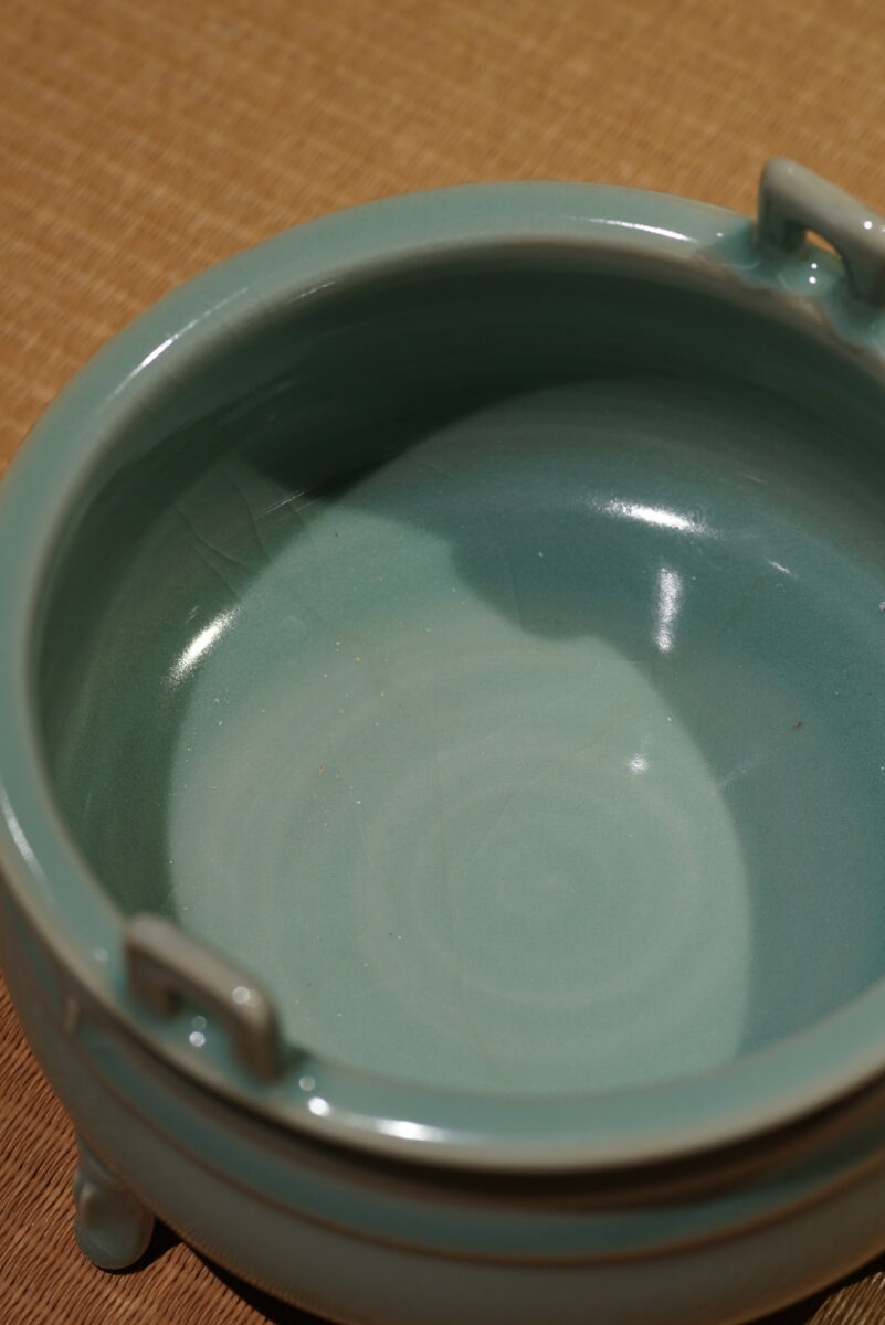 高过耳10.5cm 外口径14cm采用龙泉当地优质的朱砂泥和原矿釉料,高温烧制而成,传统龙窑柴烧。纯手工制作,工艺精良。器型灵感来源于南宋官窑宫廷用瓷。