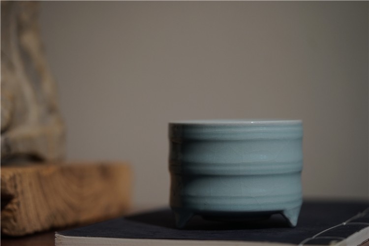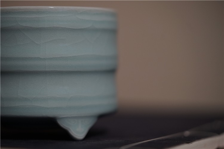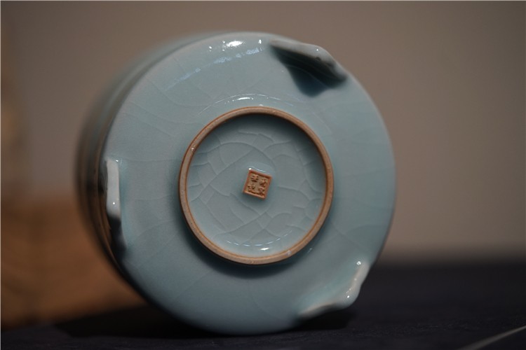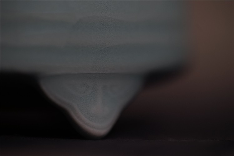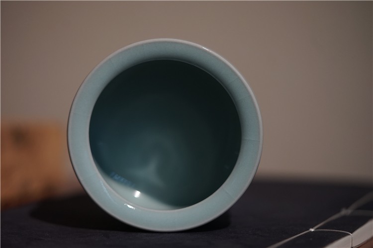 这件复刻器采用龙泉当地优质的朱砂泥料和天然原矿釉料,器物呈粉青釉色,自然开片,整体光素无纹,宋代极简审美,工艺精良,其灵感源自南宋时期龙泉窑高级古物。